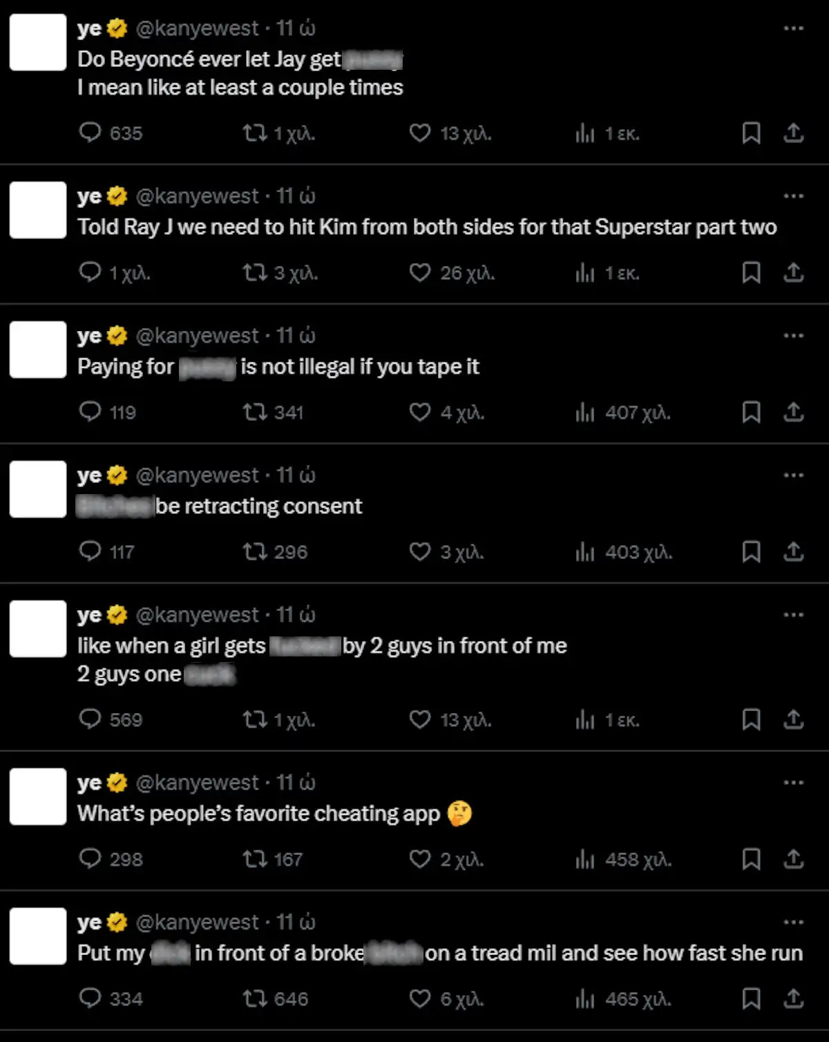 Πριν λίγο καιρό ο Κάνιε Γουέστ είχε προχωρήσει σε ένα αντισημιτικό ξέσπασμα ξανά στα social media, προκαλώντας κύμα αντιδράσεων. Σήμερα (10.04.2025), ο γνωστός ράπερ προχώρησε μια σειρά από προσβλητικές και σεξιστικές αναρτήσεις στην πλατφόρμα X (πρώην Twitter), βάζοντας στο στόχαστρο την Τέιλορ Σουίφτ, τη Μαντόνα την Κιμ Καρντάσιαν, την Μπιγιονσέ, τους φανς του, τους διοργανωτές του Super Bowl και γενικά τους… πάντες.