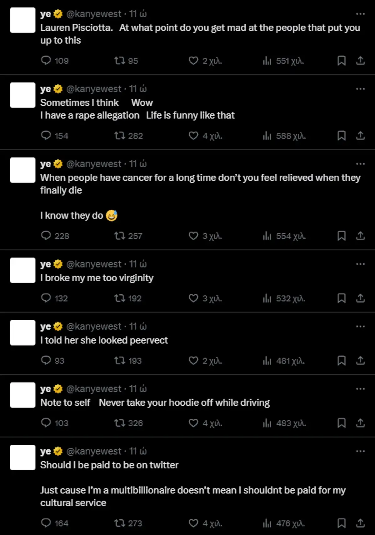 Ο Κάνιε Γουέστ που έχει συνηθίσει τον κόσμο σε αμφιλεγόμενες δηλώσεις και προκλητικές πρακτικές, προσπαθεί τώρα να σπάσει παγκόσμιο ρεκόρ στα περισσότερα tweet στο X, με τον πιο επιθετικό τρόπο, κάνοντας επίθεση online στην πρώην σύζυγό του Κιμ Καρντάσιαν αλλά και σε άλλα μεγάλα ονόματα της showbiz.