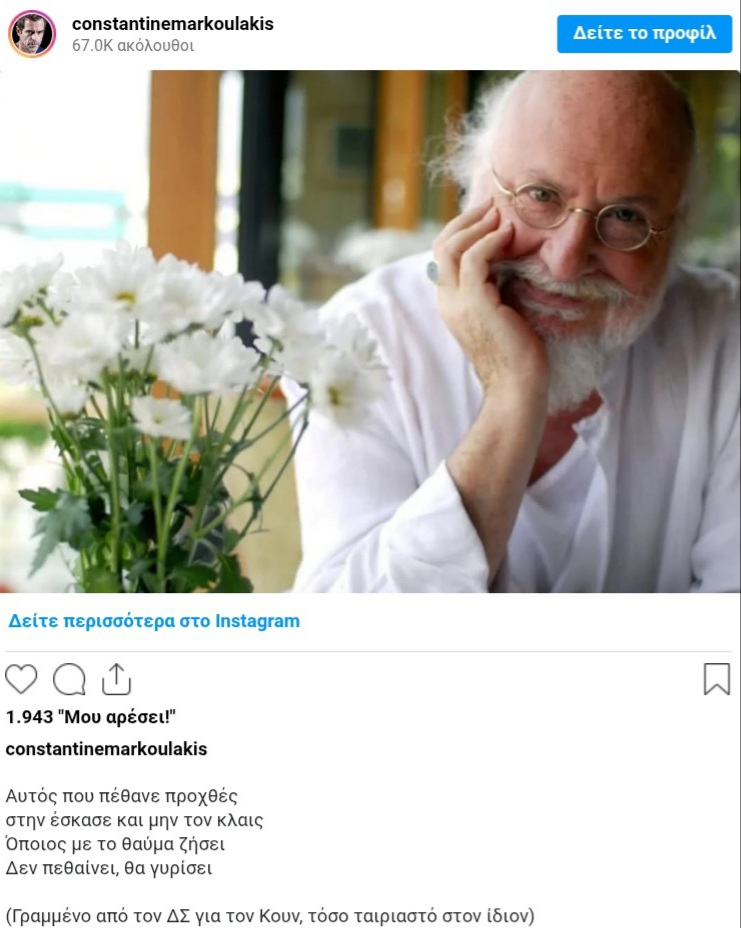 Στην ανάρτησή του, ο Κωνσταντίνος Μαρκουλάκης πρόσθεσε: «(Γραμμένο από τον Δ.Σ. για τον Κουν, τόσο ταιριαστό στον ίδιο)». Με αυτό τον τρόπο, απέτισε φόρο τιμής στον σπουδαίο δημιουργό.