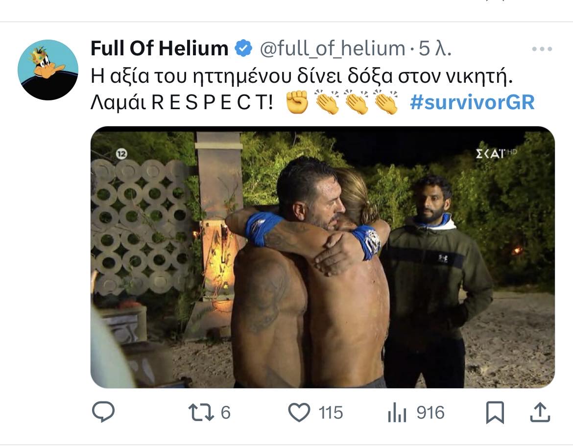 Έφυγε με το κεφάλι ψηλά με το Twitter να τον αποθεώνει και να τον αποκαλεί βασιλιά. « Είσαι μοναδικός, μας συγκίνησες, σε σεβόμαστε» , « Είσαι βασιλιάς. Respect. Υπάρχουν κάποιοι που δεν τα κάνουν όλα για τα χρήματα. Μπράβο σου» Και πολλά άλλα παρόμοια σχολια.