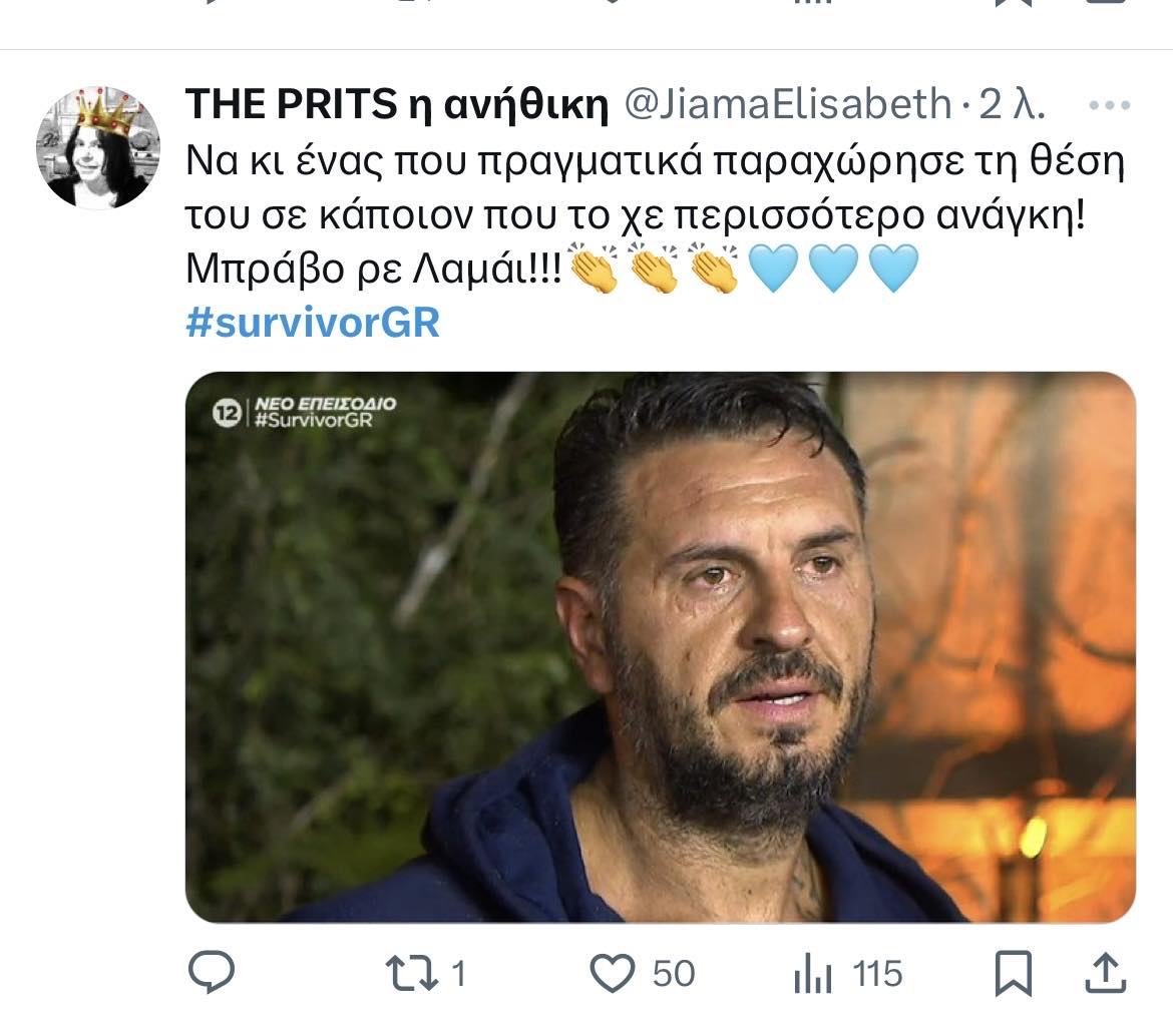 - Χτες αποχώρησε ο Λαμάϊ αφου μπορεί να μην έχασε στο αγώνισμα που αναμετρήθηκε για την παραμονή του, όμως χάρισε τον πόντο στον αντίπαλό του για να μείνει εκείνος στο παιχνίδι ως νεότερος. Δεν άντεξε ούτε κι αυτός τις κλίκες. Το ήθελε από το 2017, φέτος τα κατάφερε και όμως απέδειξε πως το ήθος και η αξιοπρέπεια δεν αγοράζονται με τα χρήματα.