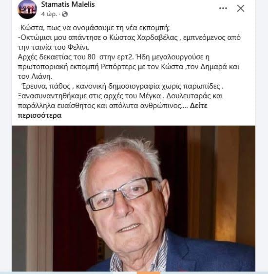 - Αρχές δεκαετίας του 80 στην Ερτ-2. Ήδη μεγαλουργούσε η πρωτοποριακή εκπομπή Ρεπόρτερς με τον Κώστα ,τον Δημαρά και τον Λιάνη. Έρευνα, πάθος , κανονική δημοσιογραφία χωρίς παρωπίδες .Ξανασυναντηθήκαμε στις αρχές του Μέγκα . Δουλευταράς και παράλληλα ευαίσθητος και απόλυτα ανθρώπινος. Αρχίζουν να λείπουν επικίνδυνα οι ερευνητές δημοσιογράφοι. Αντίο Κώστα!”
