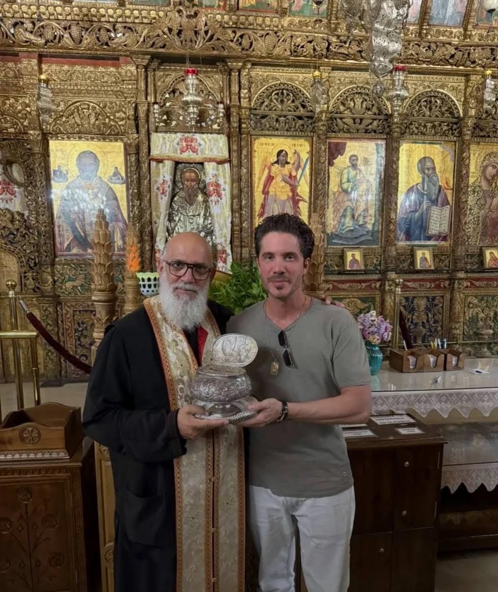 - Ο τραγουδιστής βρέθηκε στον Άγιο Κυπριανό και Αγία Ιουστίνη. Ο Πατήρ Σάββας Παύλου, μέσα από ανάρτηση που πραγματοποίησε στον λογαριασμό του στο facebook, μας ενημέρωσε για το γεγονός αυτό, αναρτώντας εικόνες των δυο τους, μέσα από την εκκλησία, κρατώντας μάλιστα τα λείψανα στα χέρια τους.