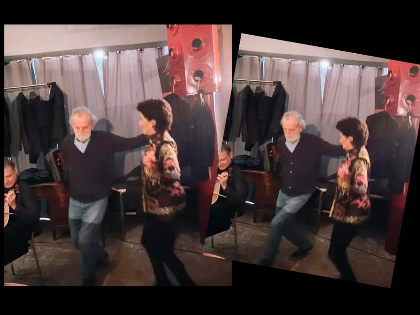 Στα καμαρίνια, μακριά από τα φώτα, χαλαρώνει, συγκεντρώνεται και μετά… ξεσπά. Ένας μικρός, σχεδόν «τρελός» χορός, γεμάτος ένταση και ενέργεια, σαν να διώχνει από πάνω της ό,τι περιττό. Δίπλα της ο Μιχάλης Αεράκης, στο ίδιο κλίμα, να μοιράζονται εκείνη τη στιγμή πριν τη σκηνή.