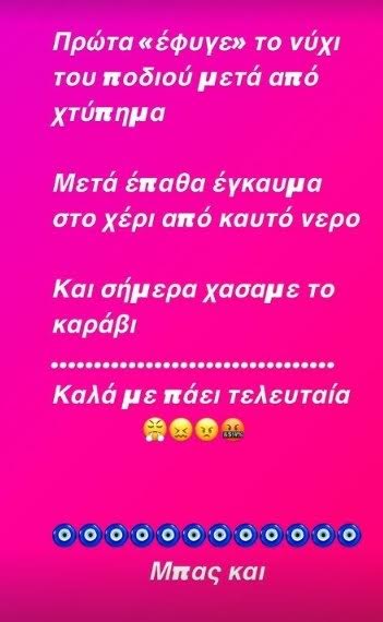 Tο πρωί της Δευτέρας, η Μπέττυ Μαγγίρα με μία ανάρτησή της στον προσωπικό της λογαριασμό στο Instagram περιέγραψε τις κακοτοπιές που της έχουν συμβεί το τελευταίο διάστημα. «Πρώτα “έφυγε” το νύχι του ποδιού μετά από χτύπημα. Μετά έπαθα έγκαυμα στο χέρι από καυτό νερό. Και σήμερα χάσαμε το καράβι. Καλά με πάει τελευταία», έγραψε χαρακτηριστικά στην ανάρτησή της η παρουσιάστρια.