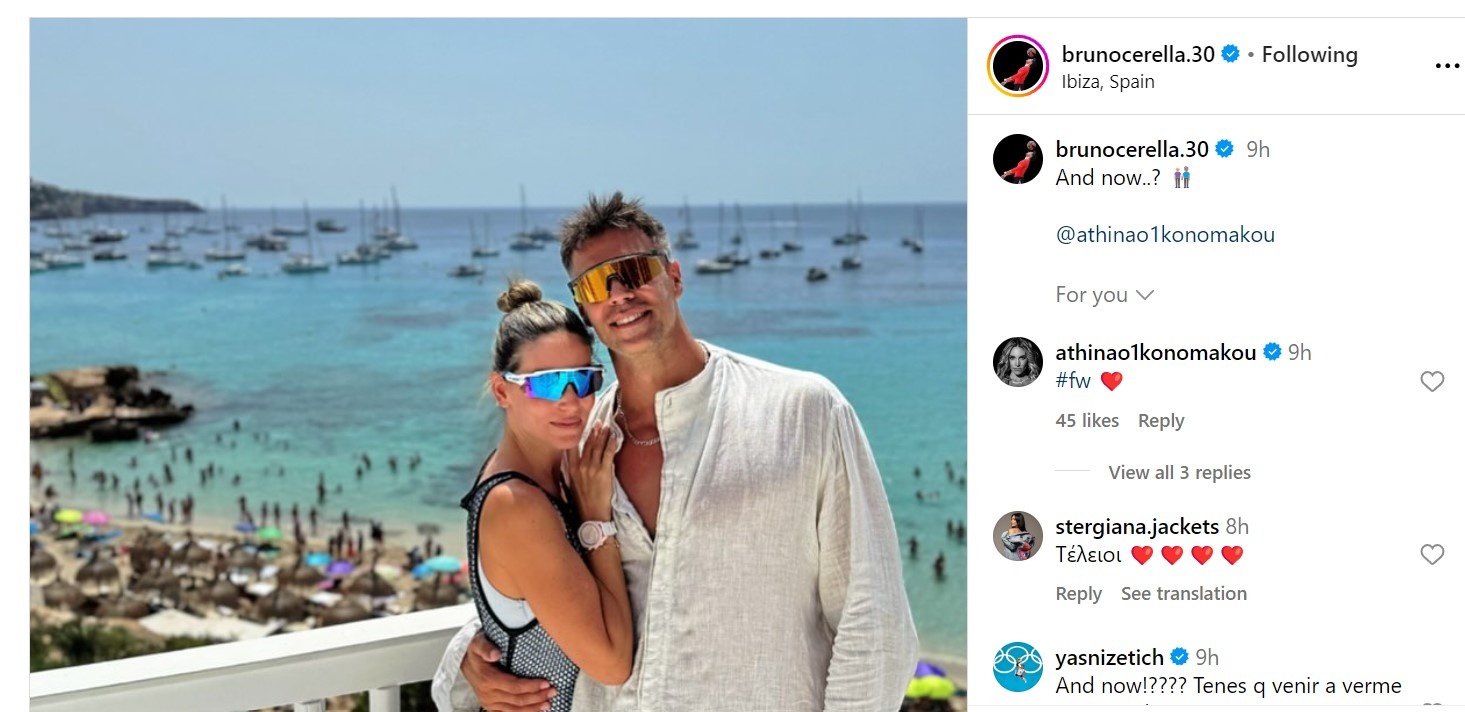 Η Αθηνά Οικονομάκου και ο Μπρούνο Τσερέλα απολαμβάνουν τις διακοπές τους και δημοσιεύουν νέα μαγικά στιγμιότυπα στους προσωπικούς τους λογαριασμούς στο instagram. Ο Μπρούνο Τσερέλα ανέβασε στα stories τους μια ρομαντική φωτογραφία με την ηθοποιό να ποζάρει στην αγκαλιά του, ωστόσο πιο ρομαντικό ήταν το σχόλιο του αφού στη φωτογραφία έγραψε τον περίφημο στίχο από το τραγούδι της Μαντόνα «La Isla Bonita» που σημαίνει «Πώς μπορεί να είναι αλήθεια;», εκφράζοντας ουσιαστικά το πόσο ωραία περνά με την Αθηνά Οικονομάκου.
