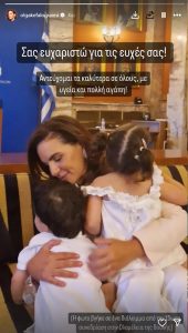 Μια μέρα μετά, το βράδυ της Παρασκευής, η υπουργός Τουρισμού μοιράστηκε μια τρυφερή φωτογραφία με τα παιδιά της «Σας ευχαριστώ για τις ευχές σας! Αντεύχομαι τα καλύτερα σε όλους, με υγεία και πολλή αγάπη!», ανέφερε στο μήνυμά της ενώ στην ίδια εικόνα σημειώνει πως η φωτογραφία τραβήχτηκε σε ένα διάλειμμα από την 15ωρη συνεδρίαση στην Ολομέλεια της Βουλής.