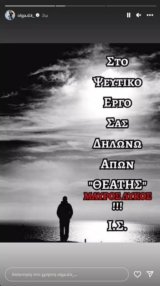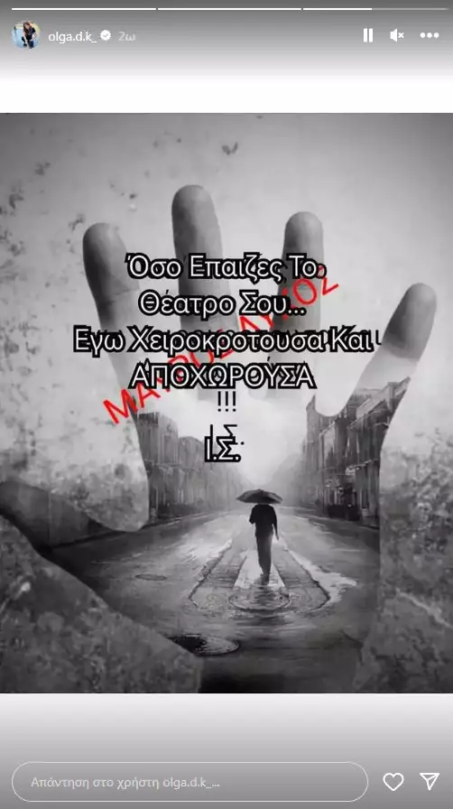 «Όσο έπαιζες το θέατρό σου εγώ χειροκροτούσα και αποχωρούσα», αναφέρει η δεύτερη ανάρτηση της Όλγας Κιουρτσάκη.