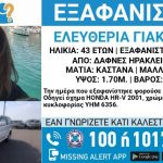 Σαν να άνοιξε η γη και να την κατάπιε… Ένα πραγματικό θρίλερ βρίσκεται σε εξέλιξη στις Δαφνές Ηρακλείου, με την εξαφάνιση μιας 43χρονης Ελευθερίας να προκαλεί σοκ και έντονη ανησυχία. Η γυναίκα έφυγε από το σπίτι της το πρωί της Κυριακής, οδηγώντας το προσωπικό της αυτοκίνητο.