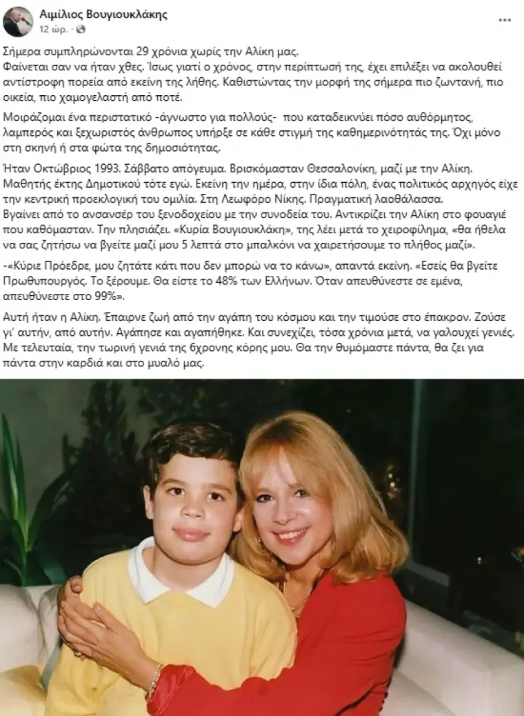 Μία άγνωστη ιστορία θέλησε να αποκαλύψει ο Αιμίλιος Βουγιουκλάκης μέσα από τον λογαριασμό του στο Facebook με αφορμή τα 29 χρόνια από τον θάνατο της Αλίκης Βουγιουκλάκη.