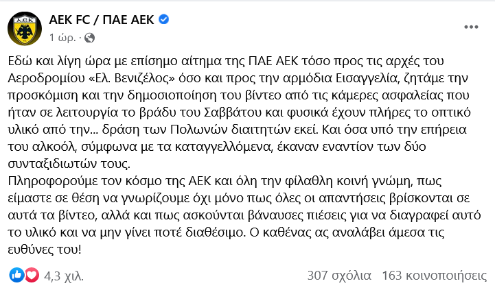 «Εδώ και λίγη ώρα με επίσημο αίτημα της ΠΑΕ ΑΕΚ τόσο προς τις αρχές του Αεροδρομίου “Ελ. Βενιζέλος” όσο και προς την αρμόδια Εισαγγελία, ζητάμε την προσκόμιση και την δημοσιοποίηση του βίντεο από τις κάμερες ασφαλείας που ήταν σε λειτουργία το βράδυ του Σαββάτου και φυσικά έχουν πλήρες το οπτικό υλικό από τη… δράση των Πολωνών διαιτητών εκεί.