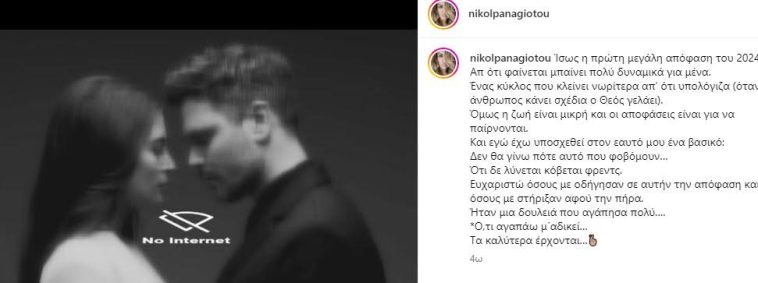 Ειδικότερα, μέσα από τον προσωπικό της λογαριασμό στο Instagram, η Νικόλ Παναγιώτου δημοσίευσε μια εικόνα από την σειρά την οποία όμως… θόλωσε ένα γραφικό με το σχόλιο «No Internet» ενώ σαν λεζάντα έγραψε τα εξής. «Ίσως η πρώτη μεγάλη απόφαση του 2024. Απ’ ότι φαίνεται μπαίνει πολύ δυναμικά για μένα».