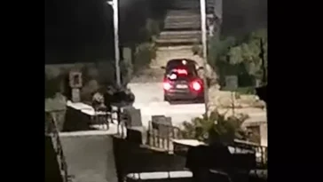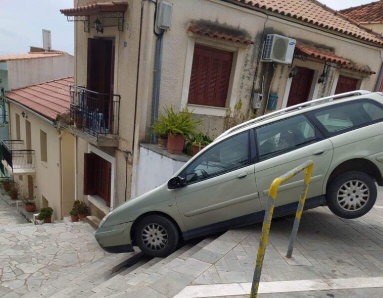 Στο σημείο έχουν σπεύσει αστυνομικοί και γίνονται προσπάθειας να ανασύρουν το όχημα από τα σκαλιά.