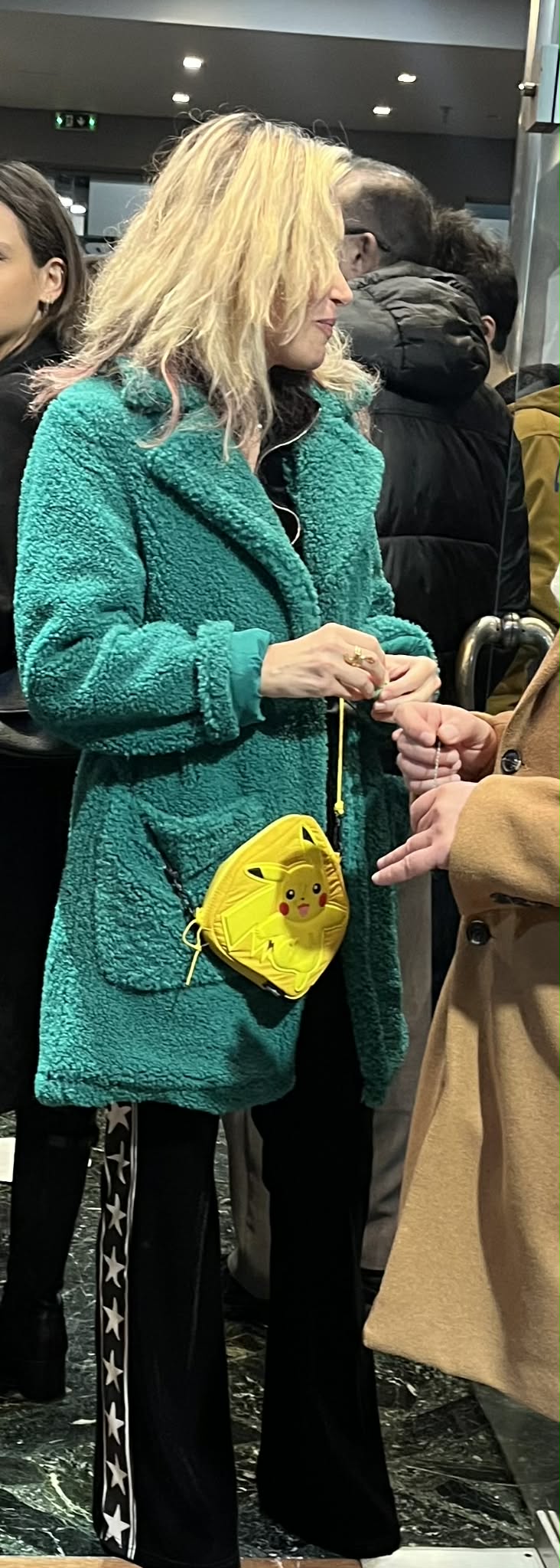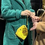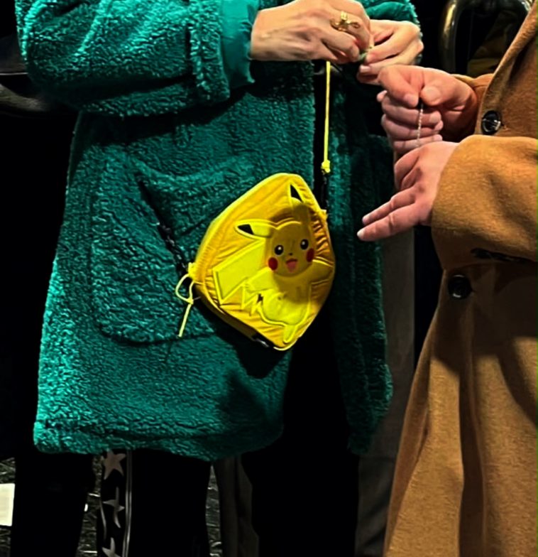 Πράσινο παλτό και κίτρινο τσαντάκι, που θα μπορούσε άνετα να κρατά ακόμη κι ένα μικρό κοριτσάκι, αφού έχει φιγούρα Pokémon.