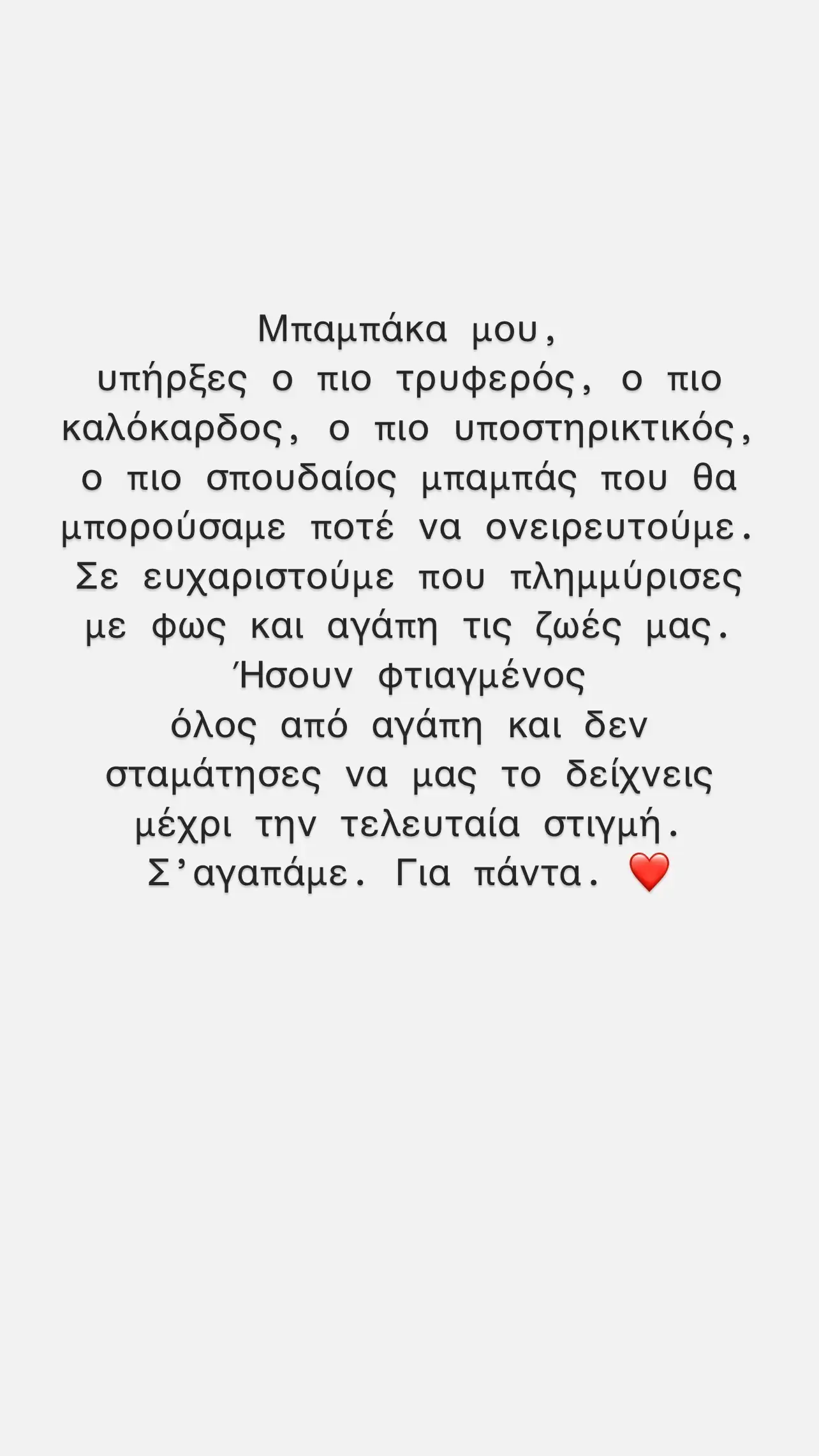 Με τη σειρά της, στον δικό της λογαριασμό στο Instagram, η Μαριέττα Φαφούτη δημοσίευσε μια παιδική φωτογραφία πλάι στον αείμνηστο της πατέρα ενώ έγραψε τα εξής: