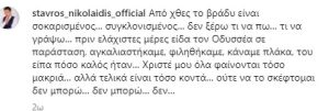 «Από χθες το βράδυ είμαι σοκαρισμένος… συγκλονισμένος… δεν ξέρω τι να πω… τι να γράψω… πριν ελάχιστες μέρες είδα τον Οδυσσέα σε παράσταση, αγκαλιαστήκαμε, φιληθήκαμε, κάναμε πλάκα, του είπα πόσο καλός ήταν… Χριστέ μου όλα φαίνονται τόσο μακριά… αλλά τελικά είναι τόσο κοντά… ούτε να το σκέφτομαι δεν μπορώ… δεν μπορώ… δεν…»