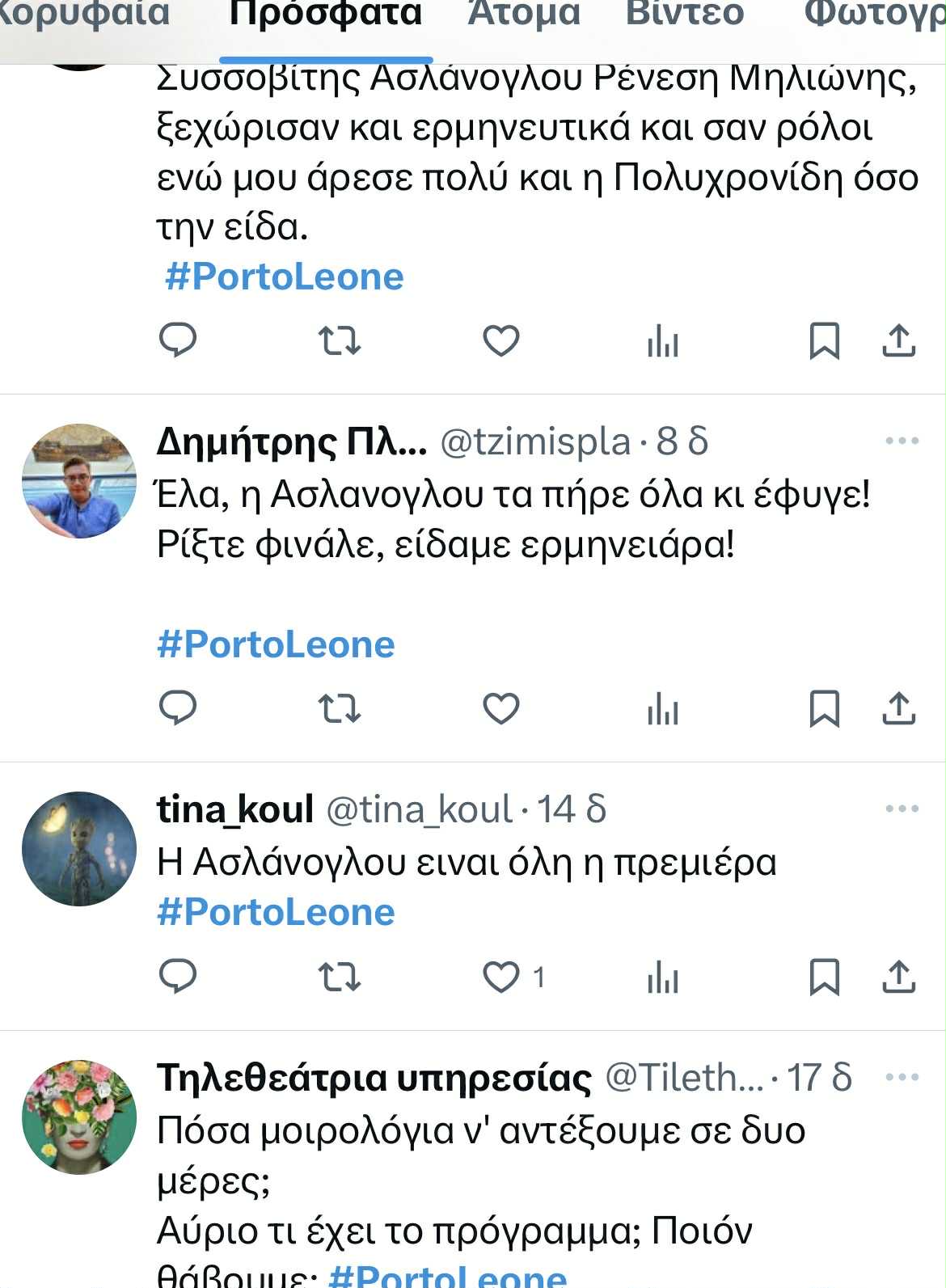 Πολύ καλές οι ερμηνείες όλων στη σειρά «Porto Leone. Στην γειτονιά με τα κόκκινα φανάρια»με τους Κλέλια Ρένεση και Μαρίνα Ασλάνογλου να κερδίζουν τους τηλεθατές.