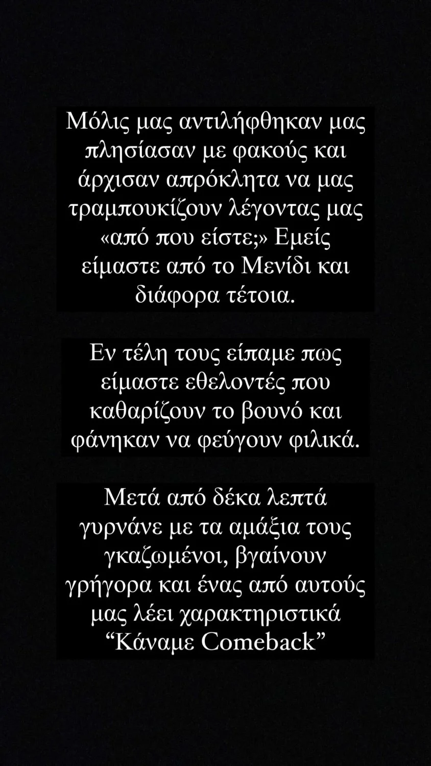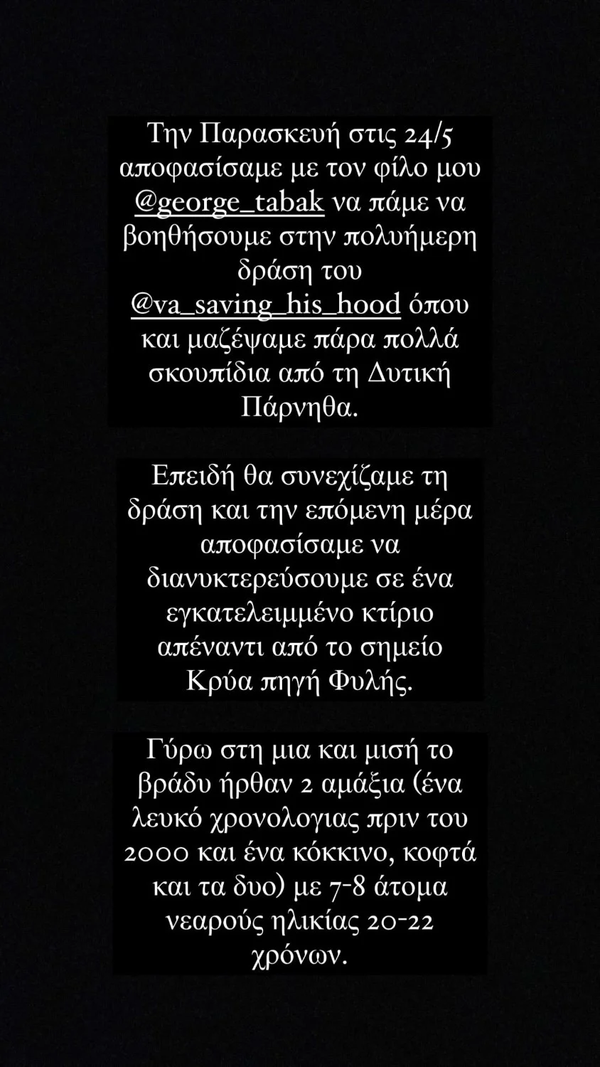 Ανθρωποκυνηγητό έχει εξαπολύσει η ΕΛ.ΑΣ. προκειμένου να εντοπίσει τους δράστες της άγριας και απρόκλητης επίθεσης που δέχτηκαν δύο εθελοντές που βοηθούσαν στον καθαρισμό της Πάρνηθας. Τα θύματα περιέγραψαν τις στιγμές τρόμου στις καταθέσεις τους. Το σοκαριστικό περιστατικό, από το οποίο ευτυχώς, δεν θρηνήσαμε θύματα, συνέβη την Παρασκευή, 24/05, όταν ομάδα ατόμων αποφάσισε να βοηθήσει τη δράση της οργάνωσης Save Your Hood, μαζεύοντας σκουπίδια από τη δυτική Πάρνηθα. Σύμφωνα με πηγές της ΕΛ.ΑΣ. επτά άγνωστοι δράστες ηλικίας 20-23 ετών, αδύνατοι, ύψους 1.75 περίπου, επιβαίνοντες σε ένα λευκό και ένα κόκινο ΙΧ πλησίασαν, κρατώντας φακούς, τους δύο εθελοντές, ηλικίας 33 και 32 ετών, οι οποίοι κοιμόντουσαν σε εγκαταλελειμμένο οίκημα απέναντι από την Κρύα Πηγή Φυλής.