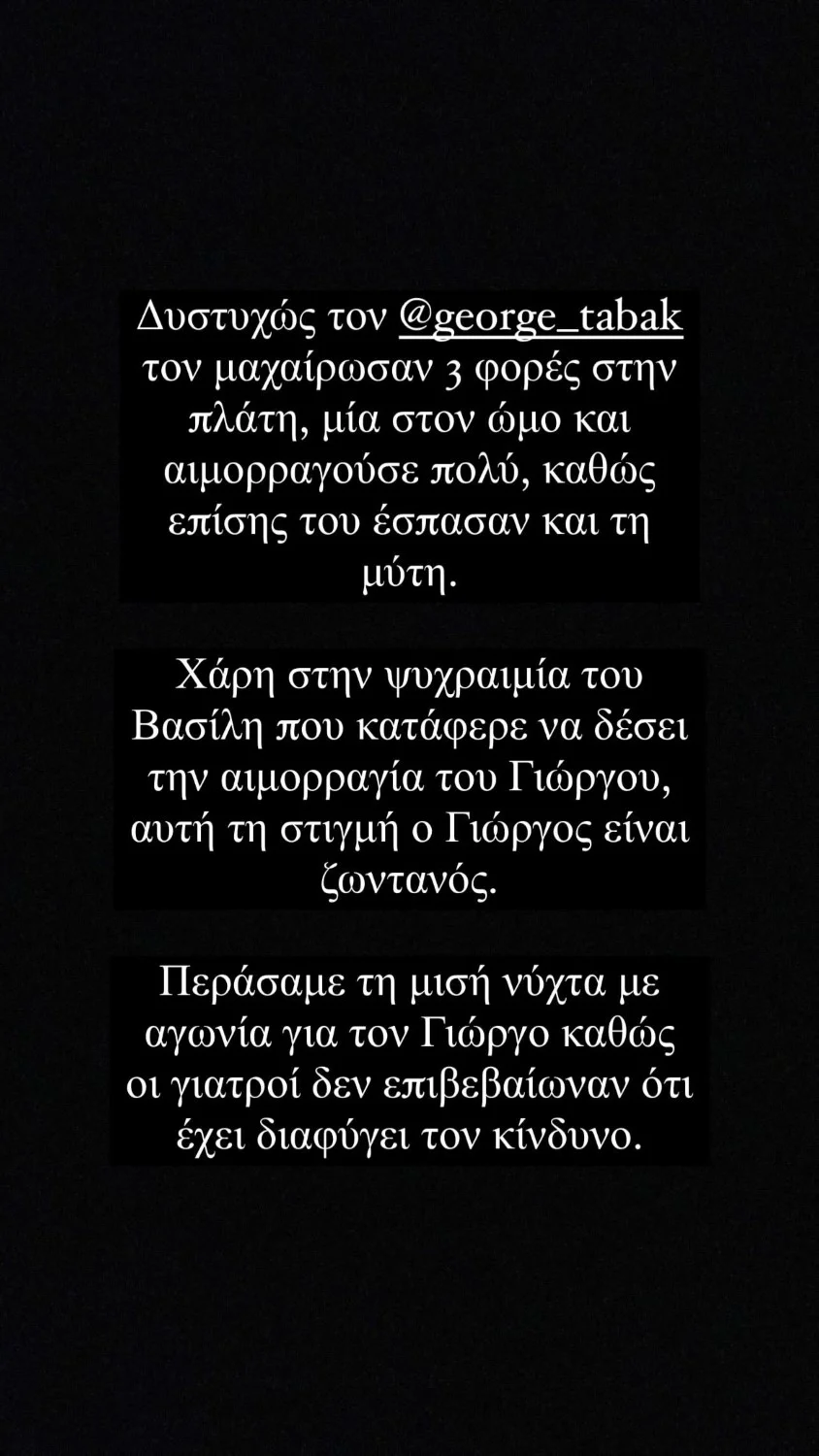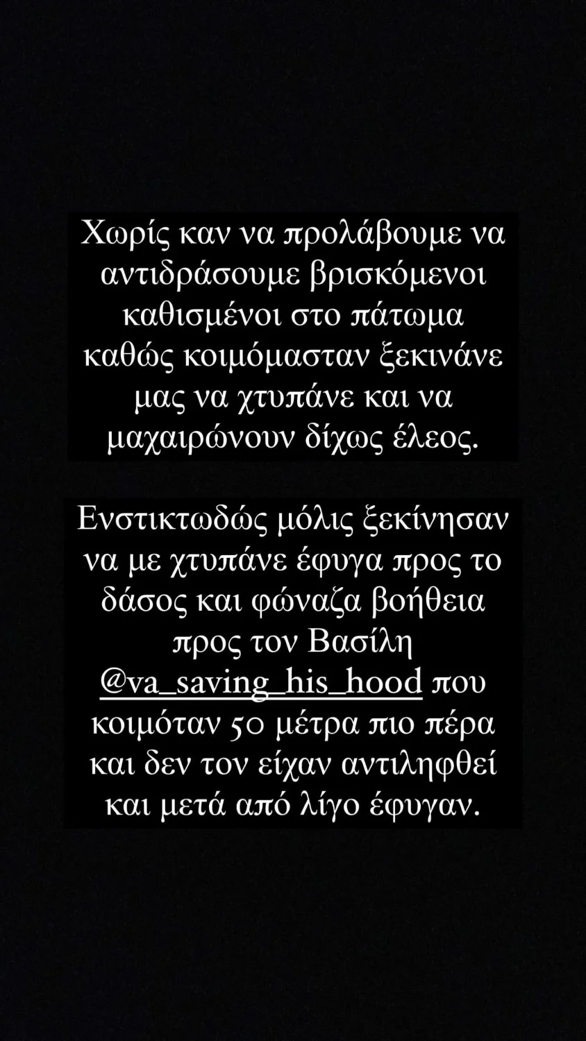 - Τα εθελοντικά μέλη της οργάνωσης «SAVE YOUR HOOD» είχαν ανέβει εκεί από το απόγευμα για να το καθαρίσουν από σκουπίδια και θα διανυκτέρευαν για να συνεχίσουν το πρωί. Ξύπνησαν από τον θόρυβο και οι δράστες άρχισαν να τους κάνουν διάφορες ερωτήσεις, όπως «τι ομάδα είσαι;», «είσαι αναρχικός;», ενημερώνοντάς τους ότι είναι από το Μενίδι. Τα δύο θύματα τους είπαν ότι είναι εθελοντές και δεν ασχολούνται με αυτά, τους χαιρέτησαν φιλικά και έφυγαν από το σημείο. Μετά από δέκα λεπτά όμως, οι δράστες επέστρεψαν. Φωνάζοντας «κάναμε comeback» ξεκίνησαν να τους χτυπάνε αδιακρίτως με κλωτσιές και μπουνιές, με αποτέλεσμα ο ένας να τραυματιστεί στο πρόσωπο και να σπάσει την μύτη του, ενώ ο δεύτερος να τραυματιστεί στο δεξί φρύδι και στο κεφάλι. Ο ένας από τα θύματα κατάφερε να ξεφύγει και άρχισε να τρέχει για να ζητήσει βοήθεια από άλλους δύο εθελοντές οι οποίοι είναι και αυτοί εθελοντικά μέλη της ίδιας οργάνωσης και κοιμόντουσαν σε ένα εκκλησάκι, σε απόσταση πενήντα μέτρων. Μόλις γύρισαν όλοι μαζί στο σημείο, οι δράστες είχαν αποχωρήσει και βρήκαν τον ένα εθελοντή αιμόφυρτο στο έδαφος, όπου διαπίστωσαν ότι το είχαν μαχαιρώσει σε διάφορα μέρη του σώματος του. Αμέσως τον μετέφεραν με το αυτοκίνητο τους στο Αττικό Νοσοκομείο, όπου τους παρασχέθηκαν οι πρώτες βοήθειες και τους ενημέρωσαν ότι ο φίλος τους είχε τραυματιστεί με τρεις μαχαιριές στην αριστερή ωμοπλάτη και δύο μαχαιριές στο αριστερό βραχίονα, αλλά διέφυγε τον κίνδυνο, καθώς δεν έχουν πληγεί ζωτικά όργανα. Στο ίδιο νοσοκομείο παρασχέθηκαν οι πρώτες βοήθειες και στον δεύτερο τραυματία. Σε εξέλιξη είναι έρευνα της ΕΛΑΣ για τον εντοπισμό και τη σύλληψη των δραστών.