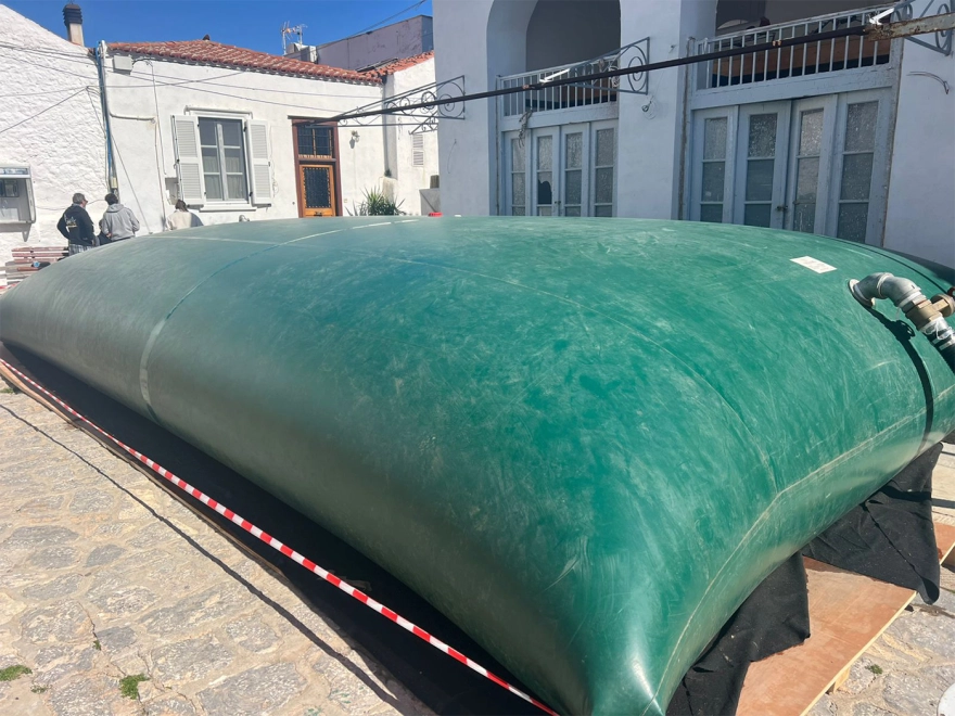 Οι δεξαμενές αυτές, μεγάλης χωρητικότητας, λειτουργούν ως προσωρινές «αποθήκες» νερού. Από εκεί, μέσω αντλιών υψηλής πίεσης, το νερό θα διοχετευτεί σε ειδικά συστήματα ψεκασμού που θα στηθούν πάνω από τον χώρο των γυρισμάτων.