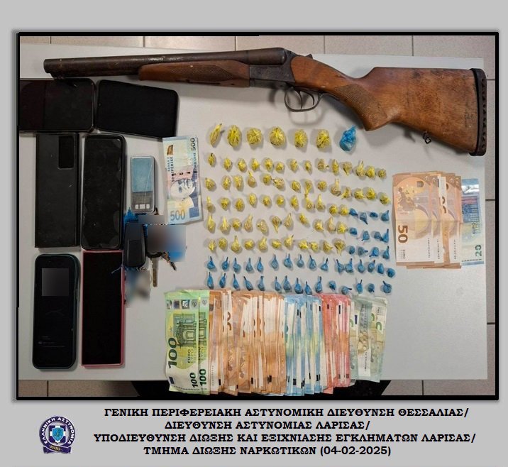 Συνελήφθησαν, χθες (03-02-2025) το μεσημέρι στον Τύρναβο, από αστυνομικούς του Τμήματος Δίωξης Ναρκωτικών της Υποδιεύθυνσης Δίωξης και Εξιχνίασης Εγκλημάτων Λάρισας, με τη συνδρομή αστυνομικών του Αστυνομικού Τμήματος Τυρνάβου, -4- ημεδαποί, ήτοι τρεις άνδρες και μία γυναίκα, σε βάρος των οποίων σχηματίστηκε δικογραφία και συγκεκριμένα, σε βάρος των τριών για παράβαση της νομοθεσίας περί ναρκωτικών και του τέταρτου για παράβαση των νομοθεσιών περί ναρκωτικών και περί όπλων.