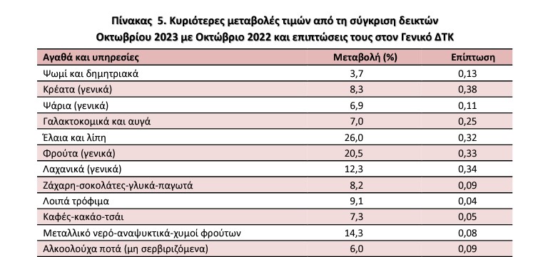 - Σύμφωνα με την ΕΛΣΤΑΤ, οι ανατιμήσεις στα τρόφιμα τον Οκτώβριο του 2023 εμφάνισαν αύξηση, σε ετήσια βάση, της τάξεως του 9,9%. Πρωταθλητές των ανατιμήσεων την ίδια περίοδο ήταν τα έλαια-λίπη με 26% καθώς και τα φρούτα με 20,5%. Διψήφια αύξηση εμφάνισαν επίσης οι κατηγορίες «μεταλλικό νερό- αναψυκτικά- χυμοί φρούτων» με 14,3% καθώς και τα λαχανικά με 12,3%.Σε ό,τι αφορά μάλιστα το ελαιόλαδο η τιμή του οποίου τραβά διαρκώς ανηφόρα τους τελευταίους μήνες – συνέπεια και των επιπτώσεων της κλιματικής αλλαγής στις χώρες που αποτελούν τις μεγαλύτερες παραγωγούς όπως Ισπανία και Ιταλία αλλά και της μειωμένης παραγωγής στην Ελλάδα- αυξήθηκε κατά 14,1% από τον Σεπτέμβριο στον Οκτώβριο του 2023.