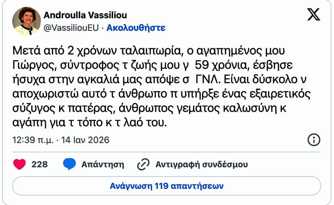 Την τελευταία του πνοή άφησε ο πρώην πρόεδρος της Κυπριακής Δημοκρατίας Γιώργος Βασιλείου σε ηλικία 94 ετών. Την είδηση θανάτου του γνωστοποίησε με ανάρτησή της η σύζυγός του, Ανδρούλλα Βασιλείου.