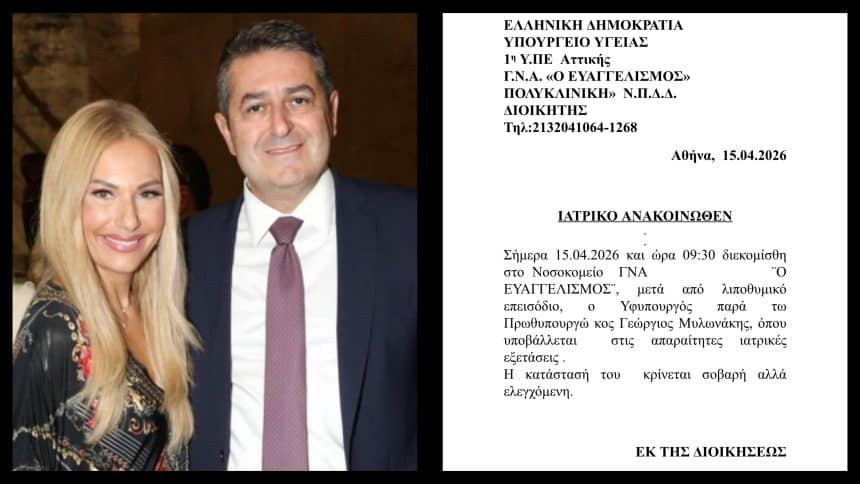 Το νοσοκομείο Ευαγγελισμός προέβη σε ιατρικό ανακοινωθέν για την κατάσταση της υγείας του Γιώργου Μυλωνάκη. Σε αυτά αναφέρεται ξεκάθαρα πως η κατάσταση της υγείας του είναι κρίσιμη.