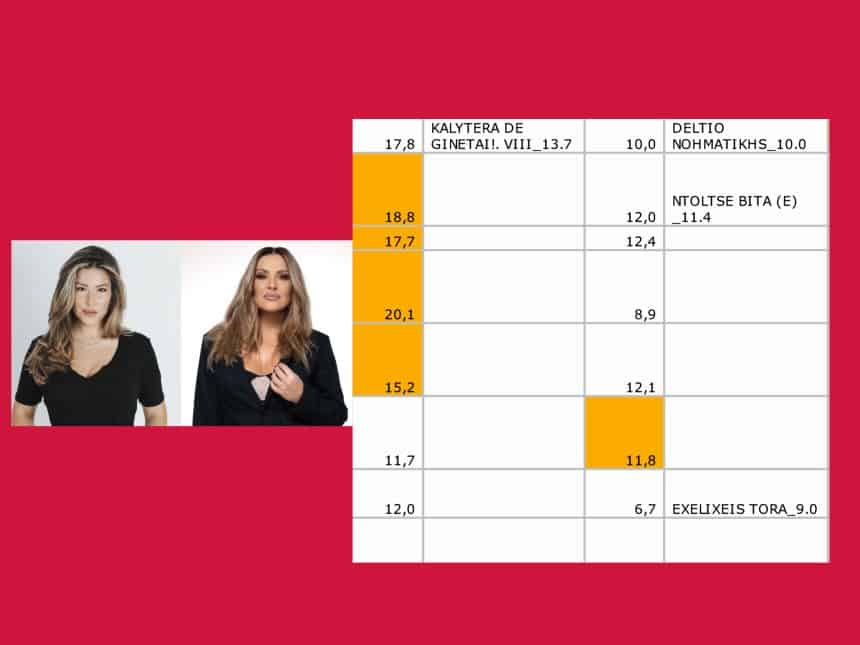 - Απέναντι της προσπαθεί η Γιάμαλη… αλλά οι αποδόσεις της είναι πολύ χαμηλές σε σχέση με τις απαιτήσεις του Μεγάλου καναλιού, ενώ ο Σκάϊ… είναι στα χειρότερα του με επιδόσεις να μην ξεπερνούν το 4%. Και αν το κάνουν πανηγυρίζουν.
