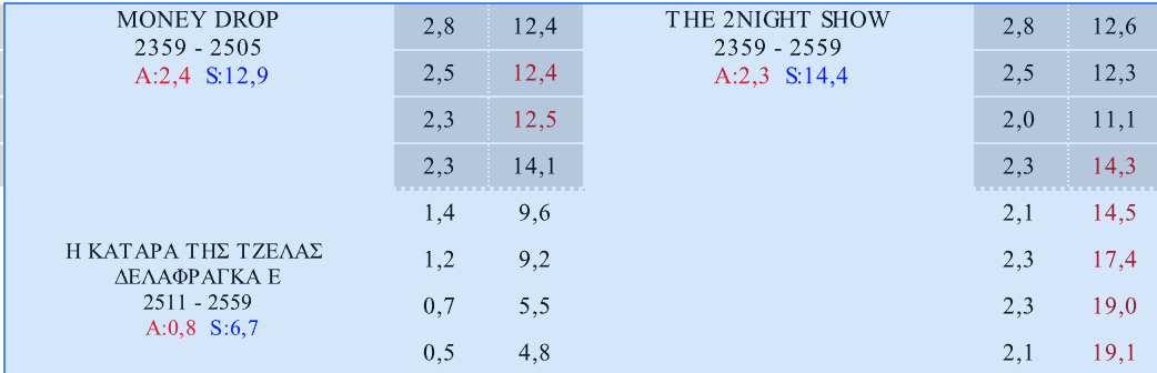 - Αναφέρομαι στον Γρηγόρη Αρναούτογλου που όχι απο ένα αλλά απο τρία τηλεοπτικά μετερίζια-εκπομπές φροντίζει να τιμά το συμβόλαιό του και να φέρνει χρήματα στο κανάλι. Την ίδια ώρα που το PrimeTime πέφτε ικαθημερινά η πρωϊνη ζώνη… έχει καρφωθεί στα μονοψήφια και καμία άλλη σοβαρή παραγωγή δεν λογίζεται ώς ανταγωνιστική στο πρόγραμμα του καναλιού.