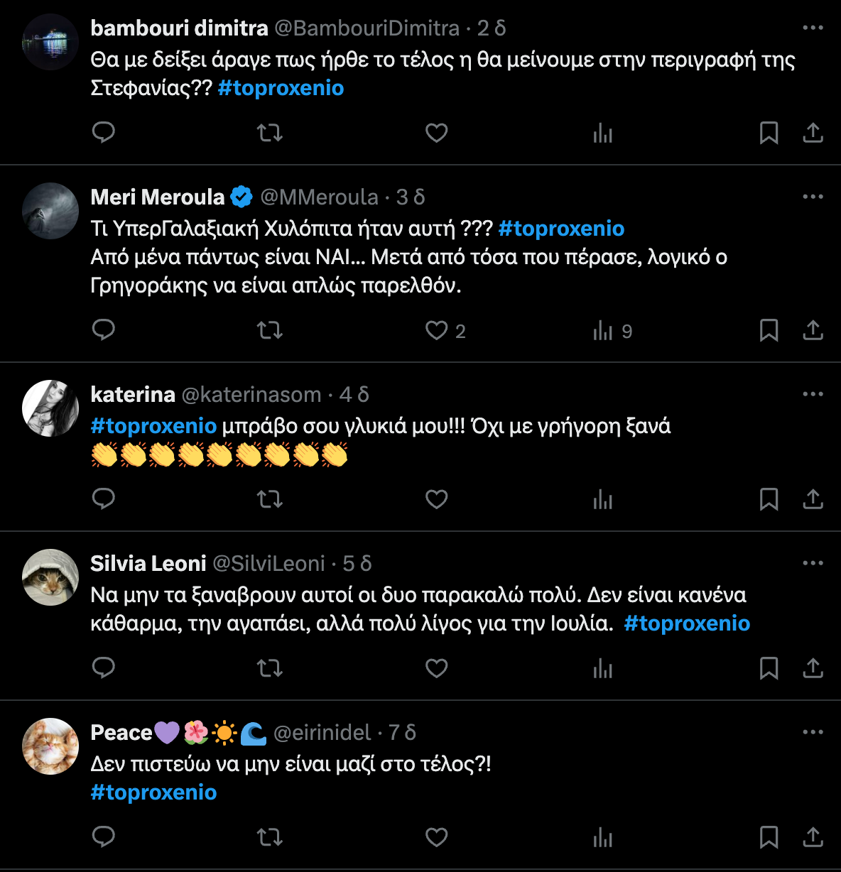 Δεν ξέρεις πόσο χαίρομαι που σε βλέπω και είσαι καλά. Σε αδίκησα κι εσένα και τον γιο μου, σας αδίκησα. Αν δεν ήμουν τόσο σκληρή τότε, αν τα είχα κάνει αλλιώς όλα, θα είχαμε αποφύγει πολλά, αλλά βλέπεις, σκουριασμένα μυαλιά, με εμμονές. Είχα τόσο μίσος μέσα μου τότε Ιουλία μου», της είπε η Κυριακούλα σε μια τυχαία συνάντηση που είχαν στον δρόμο. Ο Γρηγόρης της αποκάλυψε ότι χώρισε με τη Φιλιώ και πως εκείνη είναι πλέον με τον γιατρό. Της ζήτησε να δώσουν μια δεύτερη ευκαιρία στη σχέση τους και της είπε πως ποτέ δεν σταμάτησε να την αγαπάει. Εκείνη όμως δεν μπορούσε να είναι ξανά μαζί του. «Σ΄αγάπησα τόσο πολύ και σ΄αγαπάω ακόμα αλλά δεν ήμασταν τυχεροί», του απάντησε. Στο τέλος του επεισοδίου, είδαμε τη σκηνή με την Ιουλία να λέει στον Προβιό ότι είχε επικοινωνήσει με τον Στασινόπουλο και ήταν καθοδόν για το σπίτι τους. Όταν εκείνη τον είπε ανίκανο, την έπιασε από το ρούχο της και τής μίλησε με τα χειρότερα λόγια. Τα όσα της είπε ήταν αρκετά για να την ταράξουν ακόμα περισσότερο. Ο Γιωργίκης τής αποκάλυψε ότι ήταν εκείνος που σκότωσε και την πρώτη του γυναίκα, την Ευγενία. «Εγώ τη σκότωσα. Εγώ έβαλα δηλητήριο στα μανιτάρια και τα έδωσα στο μούλικό της για να της τα σερβίρει. Αυτό που άξιζε πήρες κι εσύ…», της είπε. «Εσύ ρε κερατά σκότωσες το Βγενιώ μου;», του είπε εκείνη και του έριξε τις τελευταίες μαχαιριές που του αφαίρεσαν τη ζωή. «Έκανα αυτό που έπρεπε! Αυτό για όσα μου έκανες, αυτό για την Ευγενία, αυτό για το Βγενιώ. Αυτό για όλες μας! Για όλες τις Ευγενίες και τις Ιουλίες. Για όλες μας», ήταν τα τελευταία λόγια που άκουσε ο Γιωργίκης την ώρα που έτρωγε τις μαχαιριές. Έπειτα, είδαμε την Ιουλία να φεύγει χαμογελώντας με τον Χρήστο, βάζοντας στο σπίτι πωλητήριο.