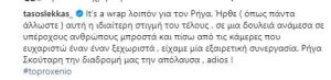 Τα γυρίσματα της σειράς ολοκληρώθηκαν και ο Τάσος Λέκκας, ο ατίθασος «Ρήγας» αδεφός της Ιουλίας, λέει αντίο «It’s a wrap λοιπόν για τον Ρήγα. Ήρθε (όπως πάντα άλλωστε ) αυτή η ιδιαίτερη στιγμή του τέλους , σε μια δουλειά ανάμεσα σε υπέροχους ανθρώπους μπροστά και πίσω από τις κάμερες που ευχαριστώ έναν έναν ξεχωριστά , είχαμε μία εξαιρετική συνεργασία. Ρήγα Σκούταρη την διαδρομή μας την απόλαυσα,adios !»
