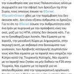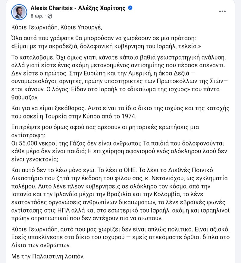 - Αφού κατηγόρησε το Ισραήλ για γενοκτονία, χαρακτήρισε τον Άδωνι Γεωργιάδη «μετανοημένο αντισημίτη», που υποκλίνεται «στο δίκιο του ισχυρού», ενώ παραλλήλισε την στάση του Ισραήλ στην Παλαιστίνη με αυτήν της Τουρκίας στην Κύπρο.
