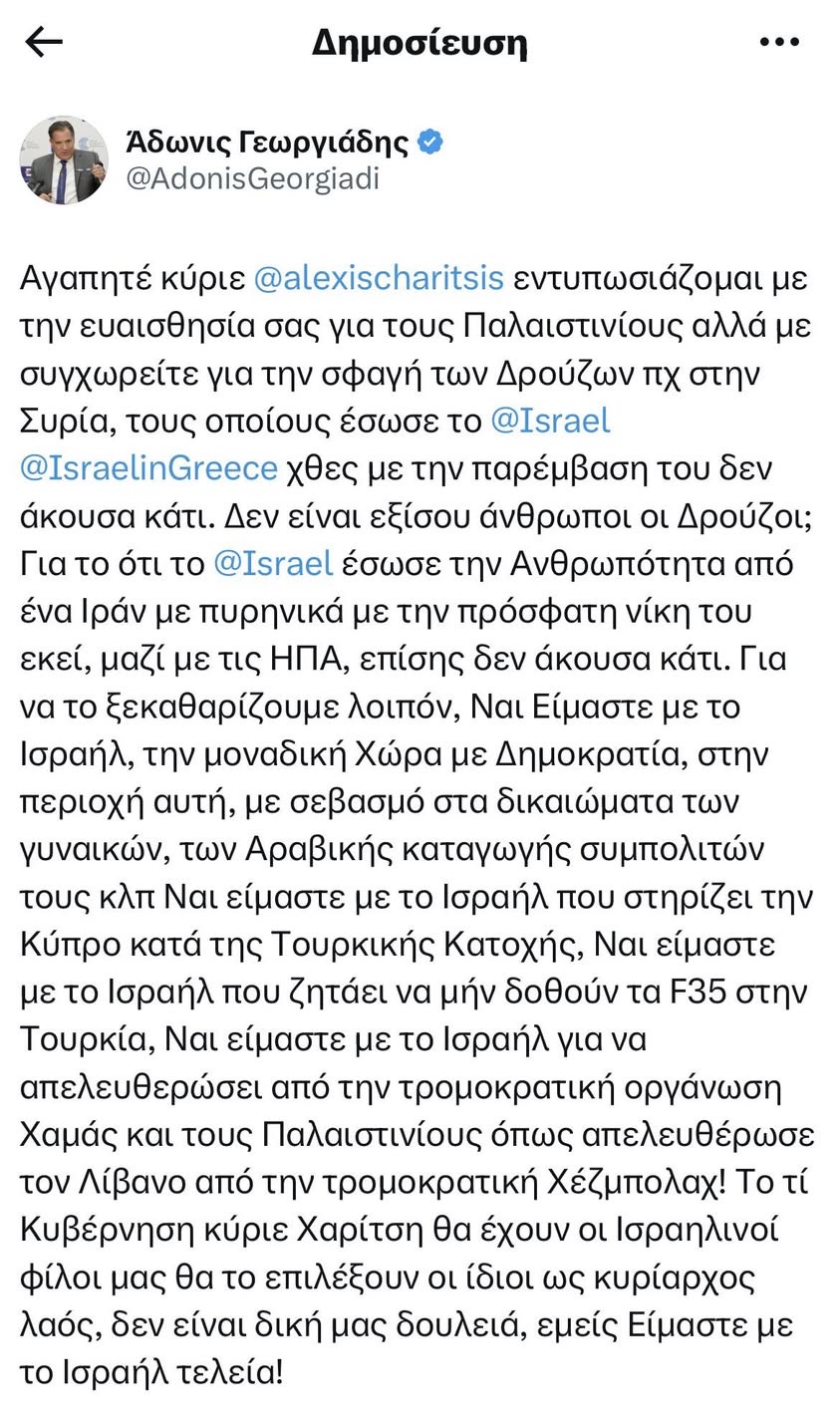 - Την αρχή έκανε ο αντιπρόεδρος της ΝΔ. Σε ανάρτηση του στο Twitter, με αφορμή τα γεγονότα στην Μέση Ανατολή, τις συγκρούσεις στην Συρία μεταξύ των Δρούζων και της κυβέρνησης του Τζολάνι και τον ρόλο του Ισραήλ σε αυτές, έβαλε στο στόχαστρο του την «Επιλεκτική ευαισθησία» του Χαρίτση.