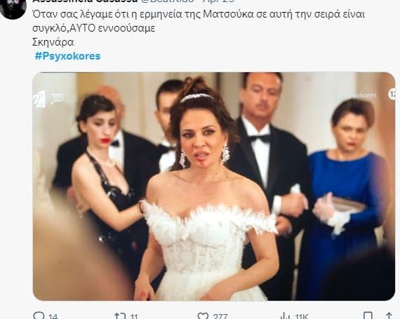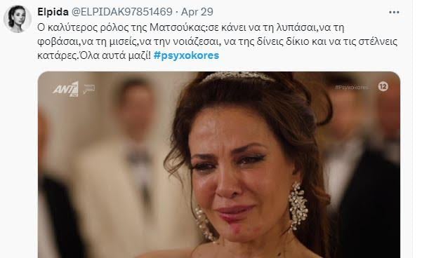 - Η στιγμή που την βάζουν στο ψυχιατρείο σοκαριστική με την Ματσούκα να δίνει ρεσιτάλ ερμηνείας «Ο καλύτερος ρόλος της Ματσούκας :σε κάνει να τη λυπάσαι, να τη φοβάσαι, να τη μισείς, να την νοιάζεσαι, να της δίνεις δίκιο και να τις στέλνεις κατάρες. Όλα αυτά μαζί» «Συγκλονιστική η Ματσούκα» γράφουν.