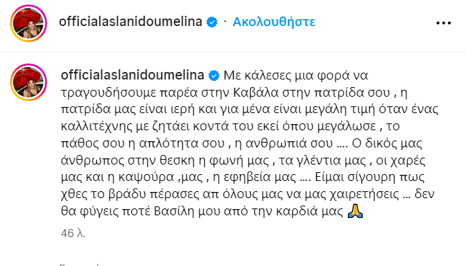 - «Με κάλεσες μια φορά να τραγουδήσουμε παρέα στην Καβάλα στην πατρίδα σου, η πατρίδα μας είναι ιερή και για μένα είναι μεγάλη τιμή όταν ένας καλλιτέχνης με ζητάει κοντά του εκεί όπου μεγάλωσε , το πάθος σου η απλότητα σου, η ανθρωπιά σου.Ο δικός μας άνθρωπος στην θεσκη η φωνή μας , τα γλέντια μας , οι χαρές μας και η καψούρα ,μας , η εφηβεία μας. Είμαι σίγουρη πως χθες το βράδυ πέρασες απ όλους μας να μας χαιρετήσεις… δεν θα φύγεις ποτέ Βασίλη μου από την καρδιά μας 🙏», έγραψε η Μελίνα Ασλανίδου στη λεζάντα της.
