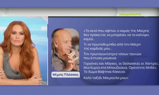 - Λόγια που συγκινούν και γεμίζουν δάκρυα τα μάτια.Ο Μίμης Πλέσσας σε δηλώσεις του στο Χαμογέλα και πάλι είπε για την αξέχαστη ηθοποιό: «Το κενό που αφήνει ο χαμός της Μαίρης Χρονοπούλου δεν πρόκειται να μπορέσει να το καλύψει καμία.Τι να πρωτοθυμηθώ για την Μαίρη της καρδιάς μου. Την πρωταγωνίστρια τόσων ταινιών που έντυσα μουσικά. Καλό ταξίδι Μαιρούλα μου».