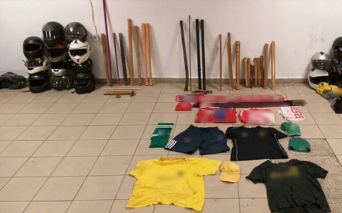 Τσεκούρια, ρόπαλα, μαχαίρια, μεταλλικές βέργες και πυροτεχνικές κατασκευές, εντοπίστηκαν και κατασχέθηκαν, μεταξύ άλλων, σε αστυνομική έρευνα που πραγματοποιήθηκε σε εγκαταλελειμμένο κτίσμα που βρίσκεται ακριβώς δίπλα από παράρτημα λέσχης φιλάθλων, στην περιοχή της Χαριλάου στη Θεσσαλονίκη.