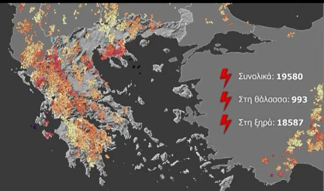 Περίπου 20.000 κεραυνοί έπεσαν την πρώτη ημέρα επιδείνωσης του καιρού, σύμφωνα με στοιχεία της υπηρεσίας meteo, του Εθνικού Αστεροσκοπείου Αθηνών. Κατά τόπους τα φαινόμενα της αλλαγής του καιρού ήταν ισχυρά, καθώς, εκτός από τους σχεδόν 20.000 κεραυνούς, ξέσπασαν ισχυρές βροχές και καταιγίδες.