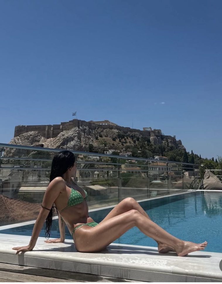 Μάλιστα χθες φωτογραφήθηκε με μαγιό σε πισίνα ξενοδοχείου με φόντο τον ιερό βράχο της Ακρόπολης γράφοντας «αν ακούσετε ένα μπαμ θα είμαι εγώ που έσκασα από το ρούφηγμα”.