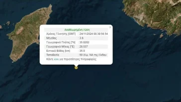 - Συγκεκριμένα το επίκεντρο του σεισμού εντοπίζεται 15 χλμ νότια της Ρόδου, ενώ το εστιακό βάθος ήταν 52,3 χλμ.