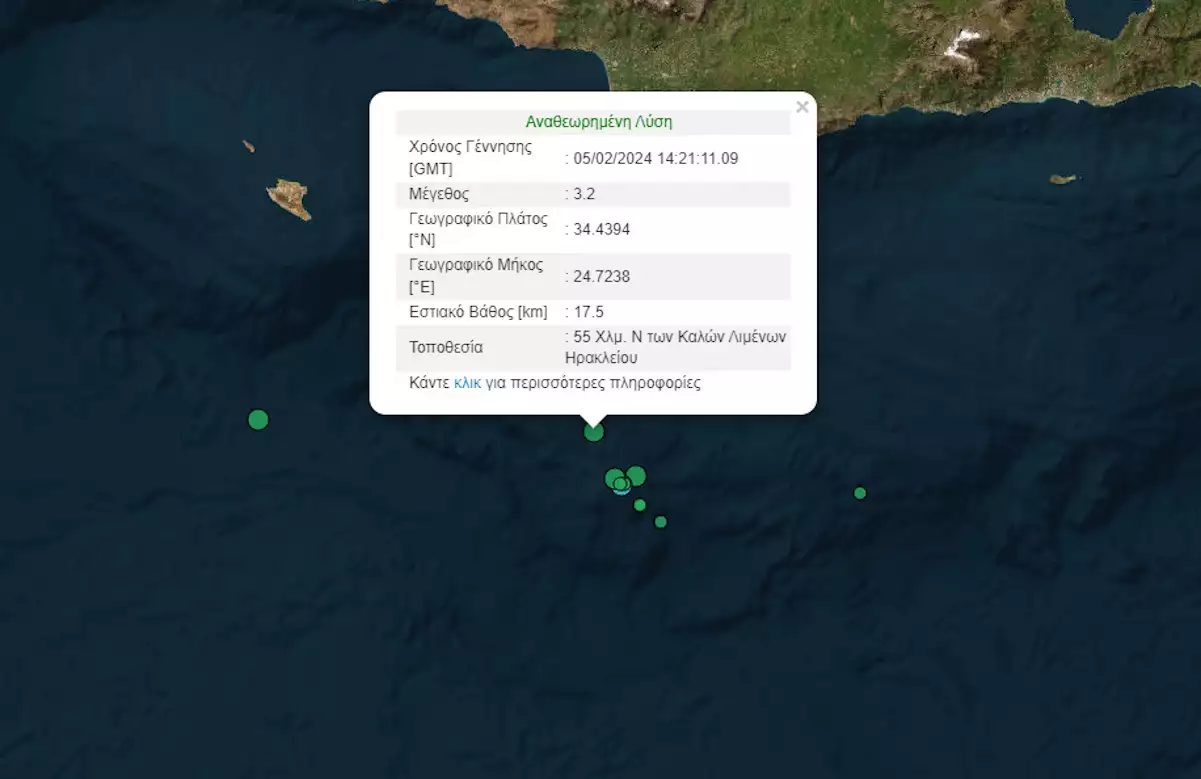Σύμφωνα με το Γεωδυναμικό Ινστιτούτο του Εθνικού Αστεροσκοπείου Αθηνών, σεισμός της τάξης 3,2 βαθμών της κλίμακας Ρίχτερ καταγράφηκε στις 4:21 το απόγευμα της Δευτέρας (05.02.2024) στο Ηράκλειο Κρήτης.