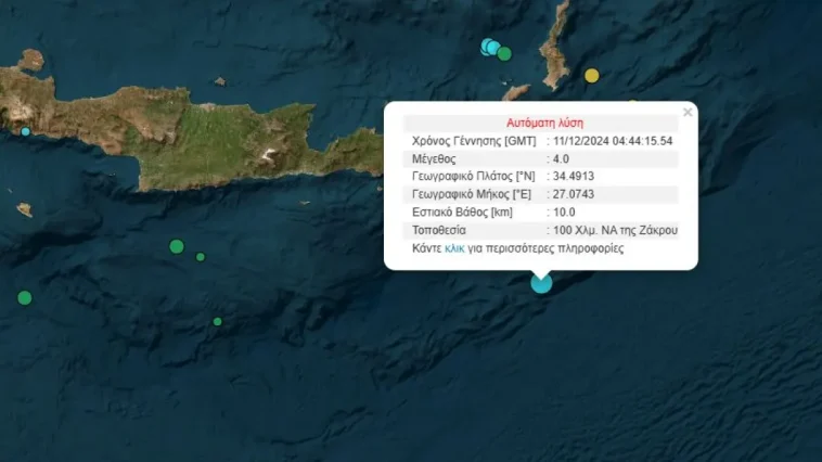 - Σύμφωνα με την αυτόματη λύση του Γεωδυναμικού Ινστιτούτου, το επίκεντρο του σεισμού εντοπίζεται 100 χλμ. νοτιοανατολικά της Ζάκρου.