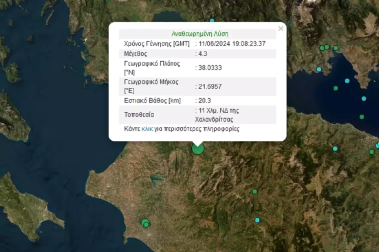 Σεισμός μεγέθους 4,3 Ρίχτερ σημειώθηκε στην Αχαΐα στην περιοχή Χαλανδρίτσα το βράδυ της Τρίτης (11/06/2024) και έγινε αισθητός στη γύρω περιοχή και στην Πάτρα.