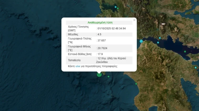 Σεισμική δόνηση μεγέθους 4,5 βαθμών της κλίμακας Ρίχτερ σημειώθηκε στις 05:49 τα ξημερώματα της Τετάρτης στα ανοιχτά της Ζακύνθου.