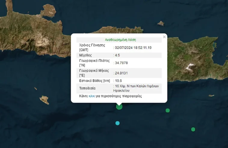 Σεισμός 4,5 Ρίχτερ σημειώθηκε στη νότια Κρήτη και συγκεκριμένα στη θαλάσσια περιοχή κάτω από τους Καλούς Λιμένες στο Ηράκλειο.
