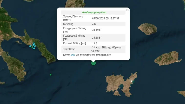 - Ο σεισμός που σημειώθηκε στις 8:18 το πρωί, είχε επίκεντρο τη θαλάσσια περιοχή 31 χλμ. βόρεια-βορειοδυτικά της Μύρινας.