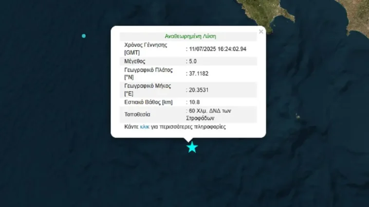 Ισχυρός σεισμός 5 Ρίχτερ σημειώθηκε το απόγευμα της Παρασκευής (11/07/2025) ανοικτά των Στροφάδων σύμφωνα με το Γεωδυναμικό Ινστιτούτο.