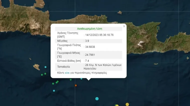 - Σύμφωνα με την αναθεωρημένη λύση του Γεωδυναμικού Ινστιτούτου – η αυτόματη λύση υπολόγισε τον σεισμό στα 3,8 Ρχίτερ – το επίκεντρο του σεισμού στην Κρήτη εντοπίστηκε στον θαλάσσσιο χώρο 28χλμ. νότια από τους Καλούς Λίμενες Ηρακλείου.