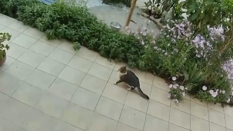 Η γάτα, κοντοστέκεται και παίρνει στάση άμυνας και μετά από λίγα δευτερόλεπτα διαισθανόμενη τον σεισμό στην κυριολεξία εξαφανίζεται. Μόλις αρχίζει η δόνηση η κάμερα ασφαλείας καταγράφει το πόσο έντονος ήταν ο σεισμός.